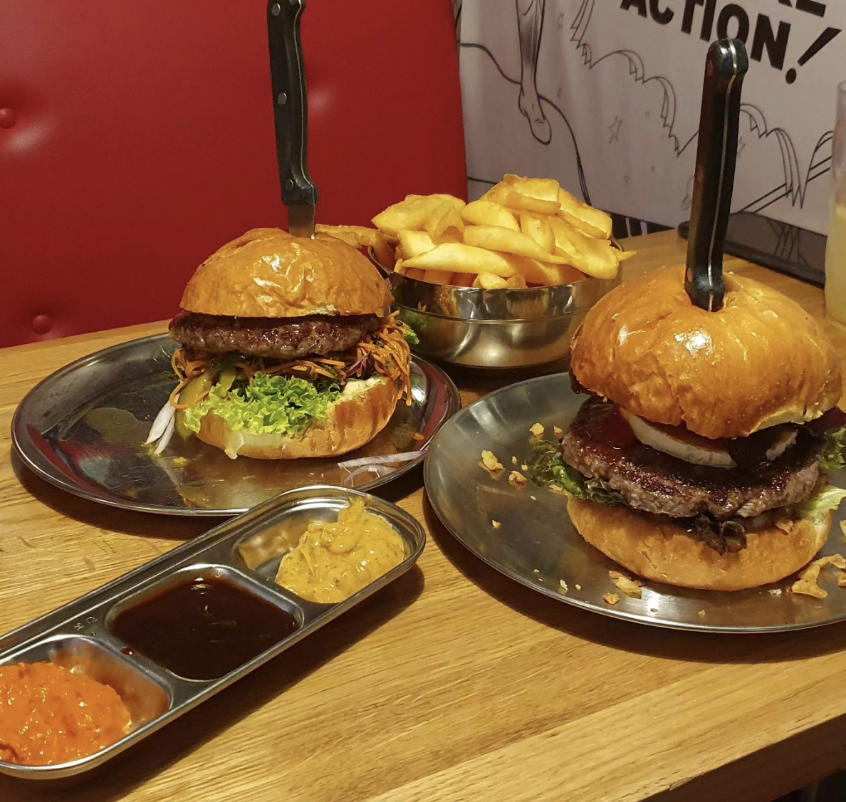 In unserem Lokal mit Comic-Helden-Dekoration gibt es innovative und auch vegetarische Burger & More. Während du im Heroes in einen der leckeren hausgemachten Burger beißt, schauen Dir Superman, Batman & Co über die Schulter. In die selbstgebackene Burger-Brötchen kommen Rindfleisch, Hühnchen, Beyond Meat oder Grillkäse und Kichererbsenpatty. Hausgemachte Soßen wie Tomatenrelish, Mayo BBQ, Aioli, Guacamole und andere gibt es dazu.